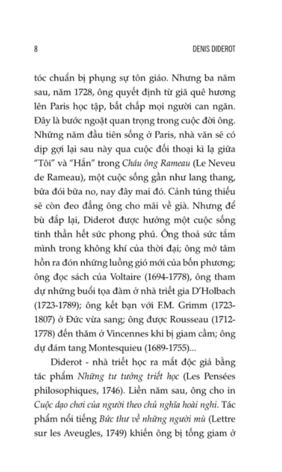 Kiệt tác Cháu ông Rameau, sáng tác khoảng năm 1761, lưu hành một vài bản ở dạng chép tay trong số bạn bè quen biết. Một bản theo Grimm về Đức, lọt vào tay Gœthe (1749 - 1832), được ông dịch ra tiếng Đức. Mãi đến 1823, Cháu ông Rameau mới được dịch lại từ bản tiếng Đức để xuất bản ở Paris, và tới gần cuối thế kỷ XIX, năm 1891, người ta mới tìm thấy nguyên bản của nó!